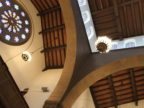 Atop the dome is a weather vane and careful attention was given to its design, too. Mr. Earl N. Dugan, architet locally in charge of construction, said that the whole weather vane is mounted on a movable ball so that during extreme winds there would be no danger of the vane being blown off, instead it can give with the wind, but will right itself again automatically. The whole vane is done in deep gold.