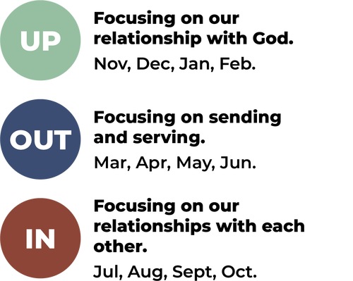 In the Winter, we spotlight the Up direction and focus our energy and attention on our relationship with God. In the Spring, we spotlight the Out direction and we focus our energy and attention on serving others and pursuing mission. In the late Summer and Fall, we spotlight the In direction and we focus our energy and attention on our relationships within the Christian community and in our marriages and families. During each of these seasons, we highlight the importance of the pertinent aspect of discipleship, challenge our congregation to grow in that area, and encourage everyone to support one another as we strive to grow in Christ together.